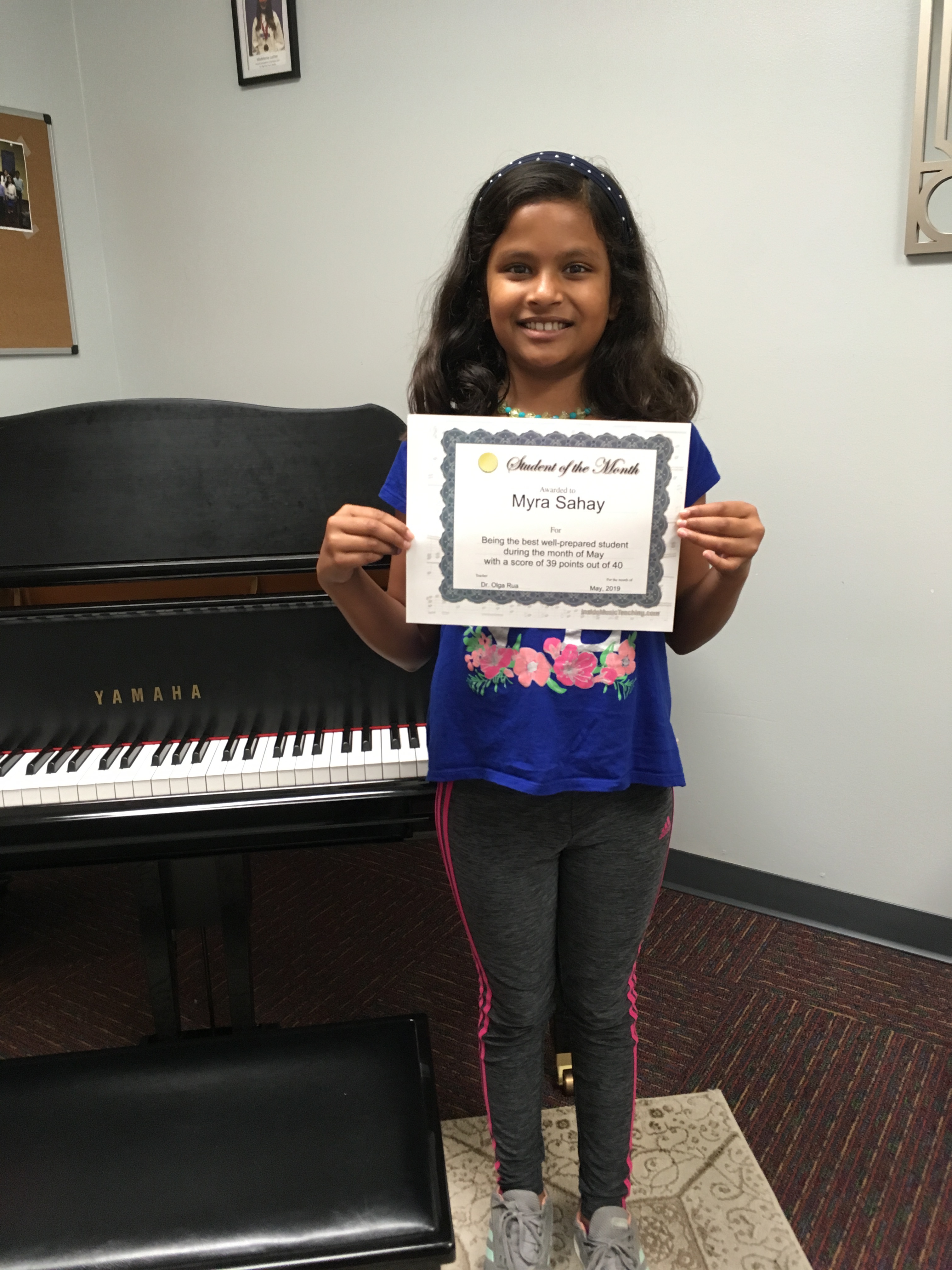 For May 2019, Myra Sahay is the student of the month with a score of 39 points out of 40.