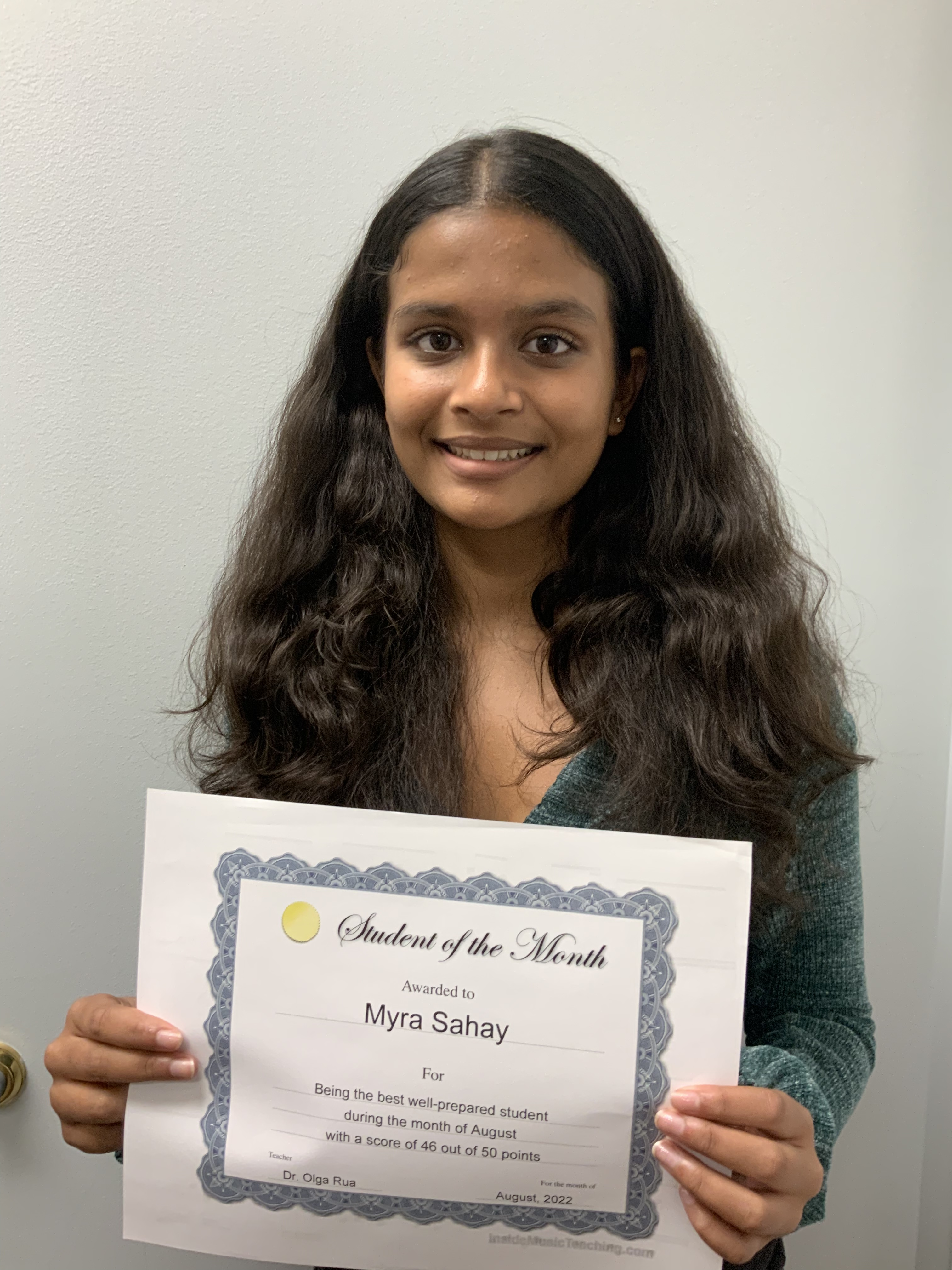 For the month of August the student of the month is Myra Sahay. Congratulations Myra!