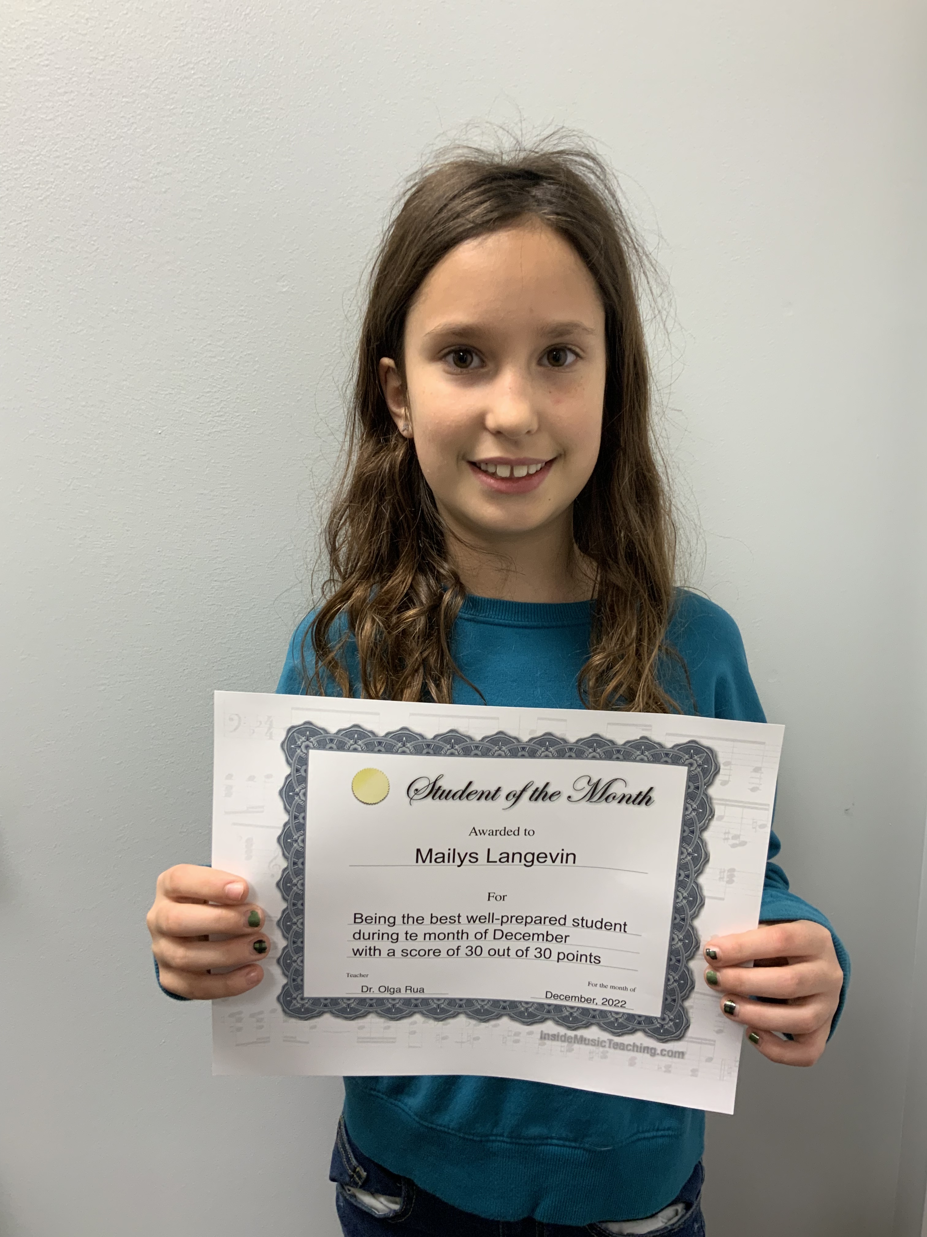 For the month of December, 2022, the “Student of the Month” is Mailys Langevin. Mailys is a very dedicated student, she started piano lessons about five months ago. She is a 4th-grader at Marymount Elementary. Besides piano, she likes basketball and wants to learn to play guitar as well.
