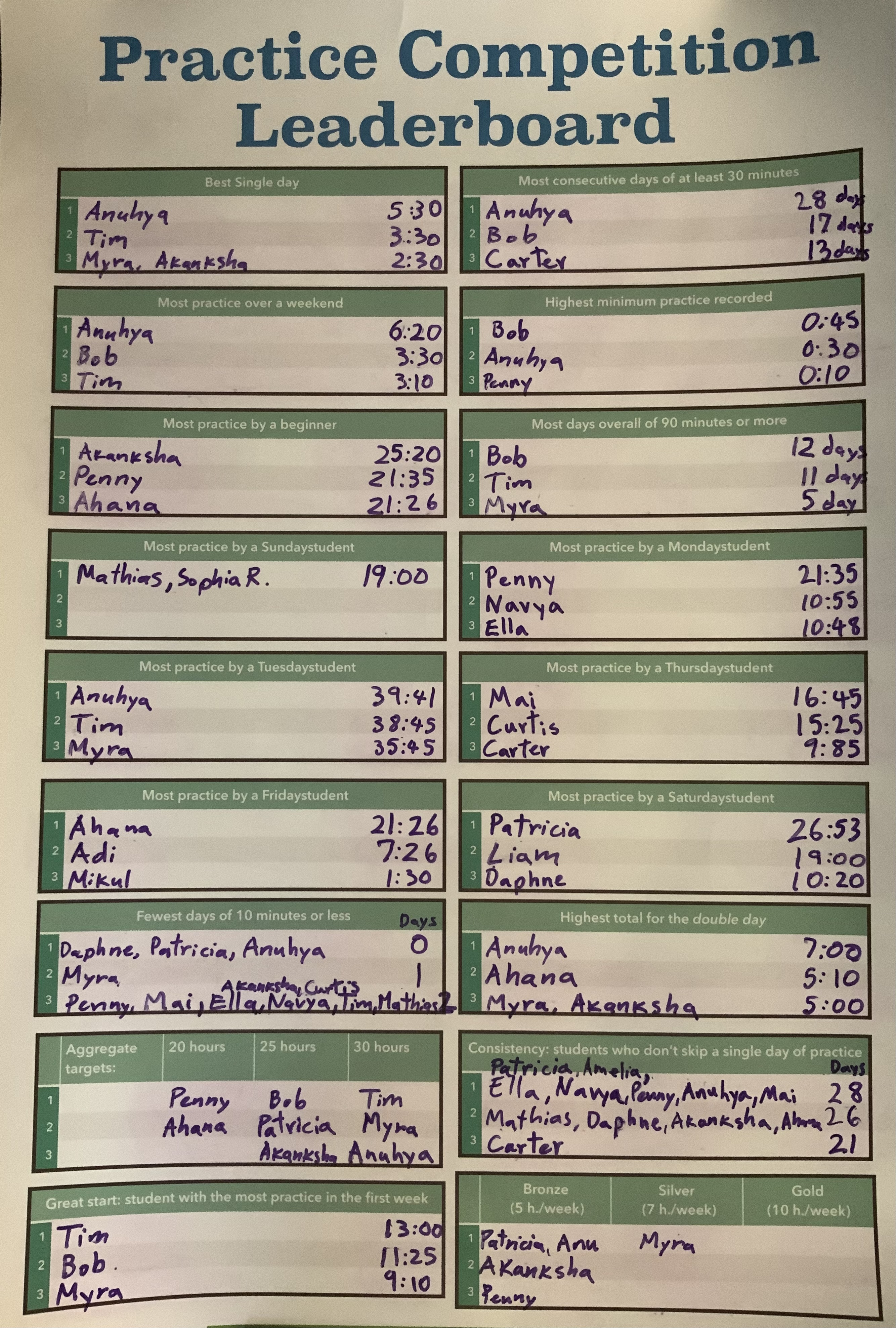 The student with the “most practice” gets the title of “champion” and the choice of prize from a list ($150 prize).