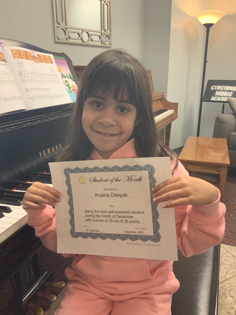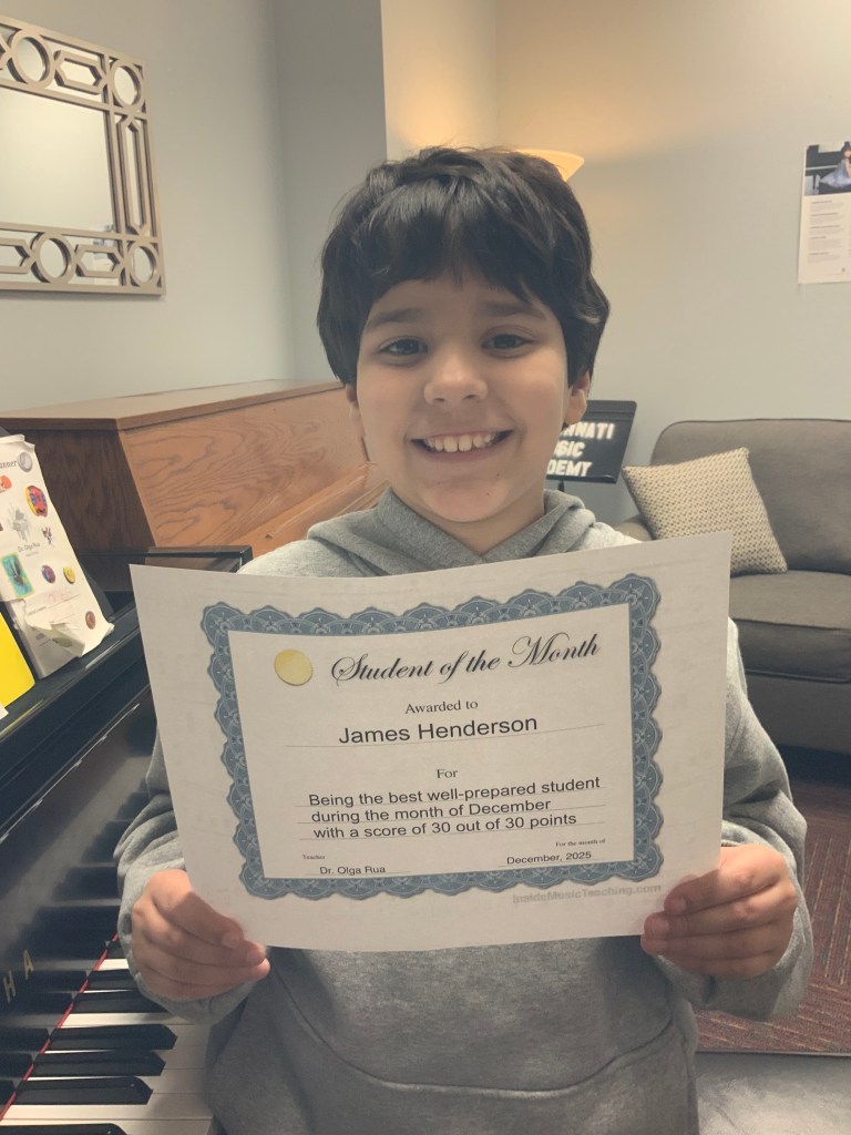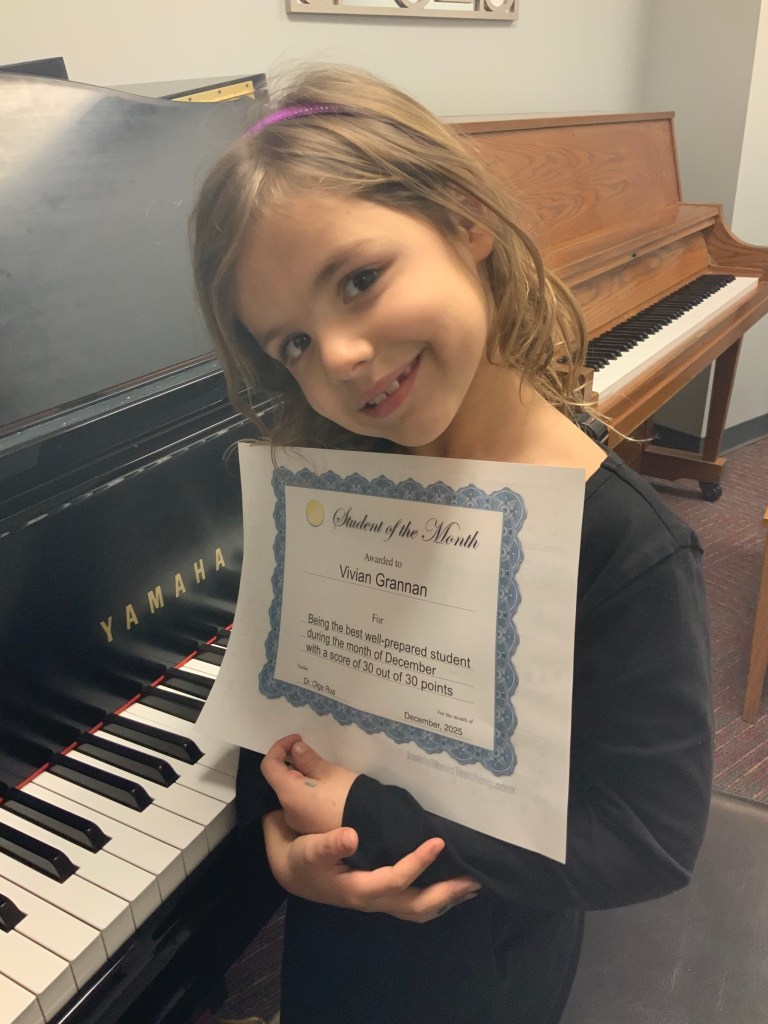 For the month of December 2025, we had three students receive the award of “Student of the Month.” They are: Vivian Grannan, James Henderson, and Anjana Deepak. Congratulations to all three for being the best well-prepared students during their lessons in December 2025.