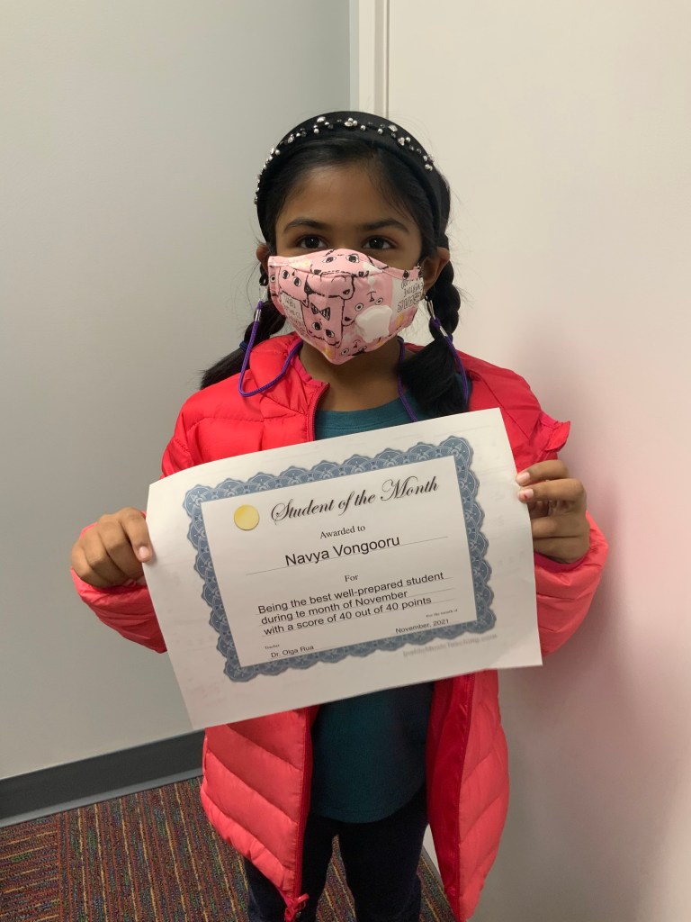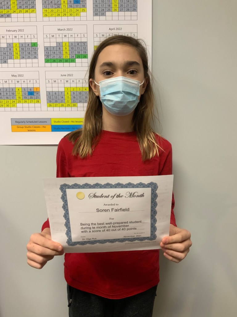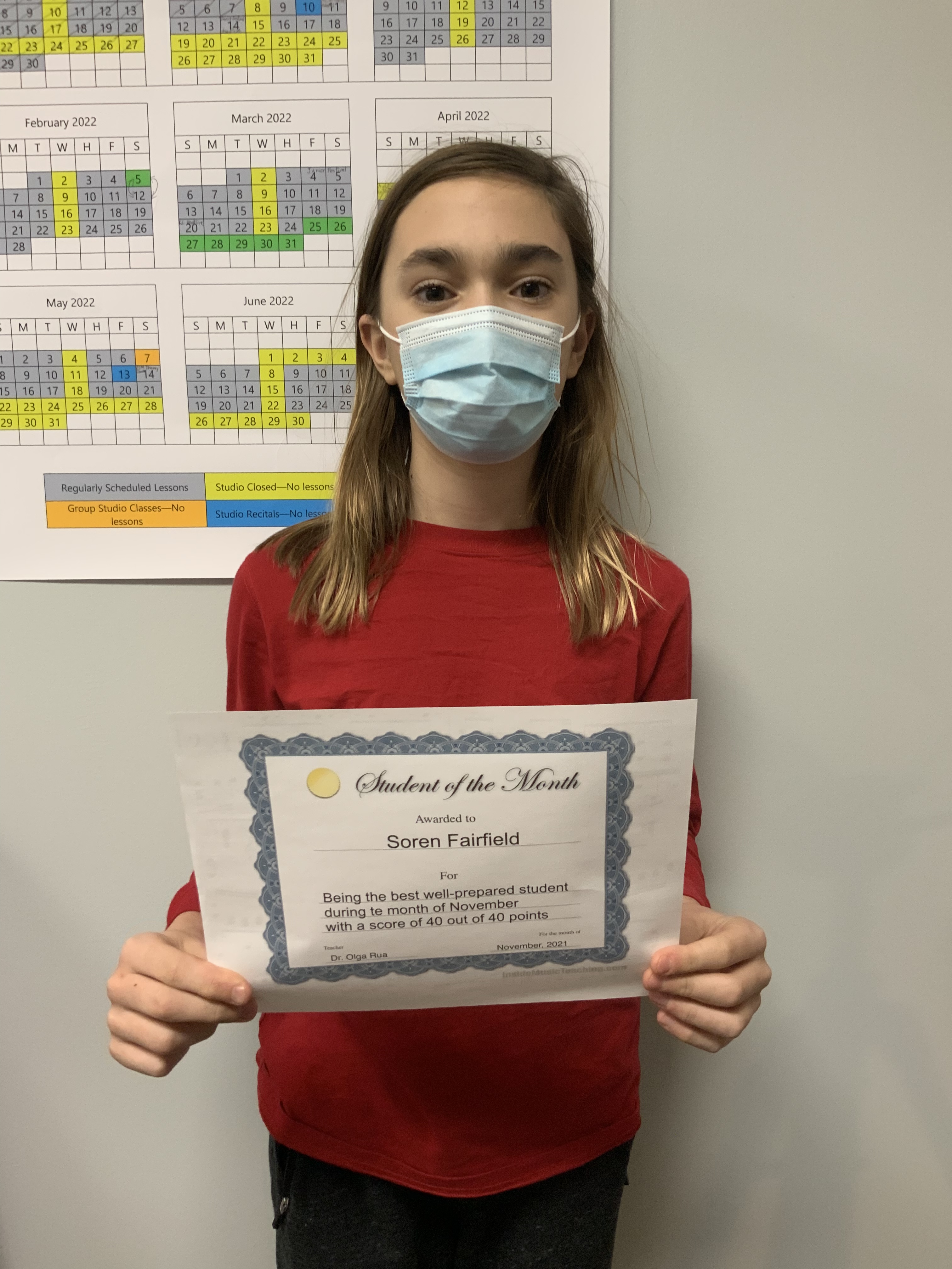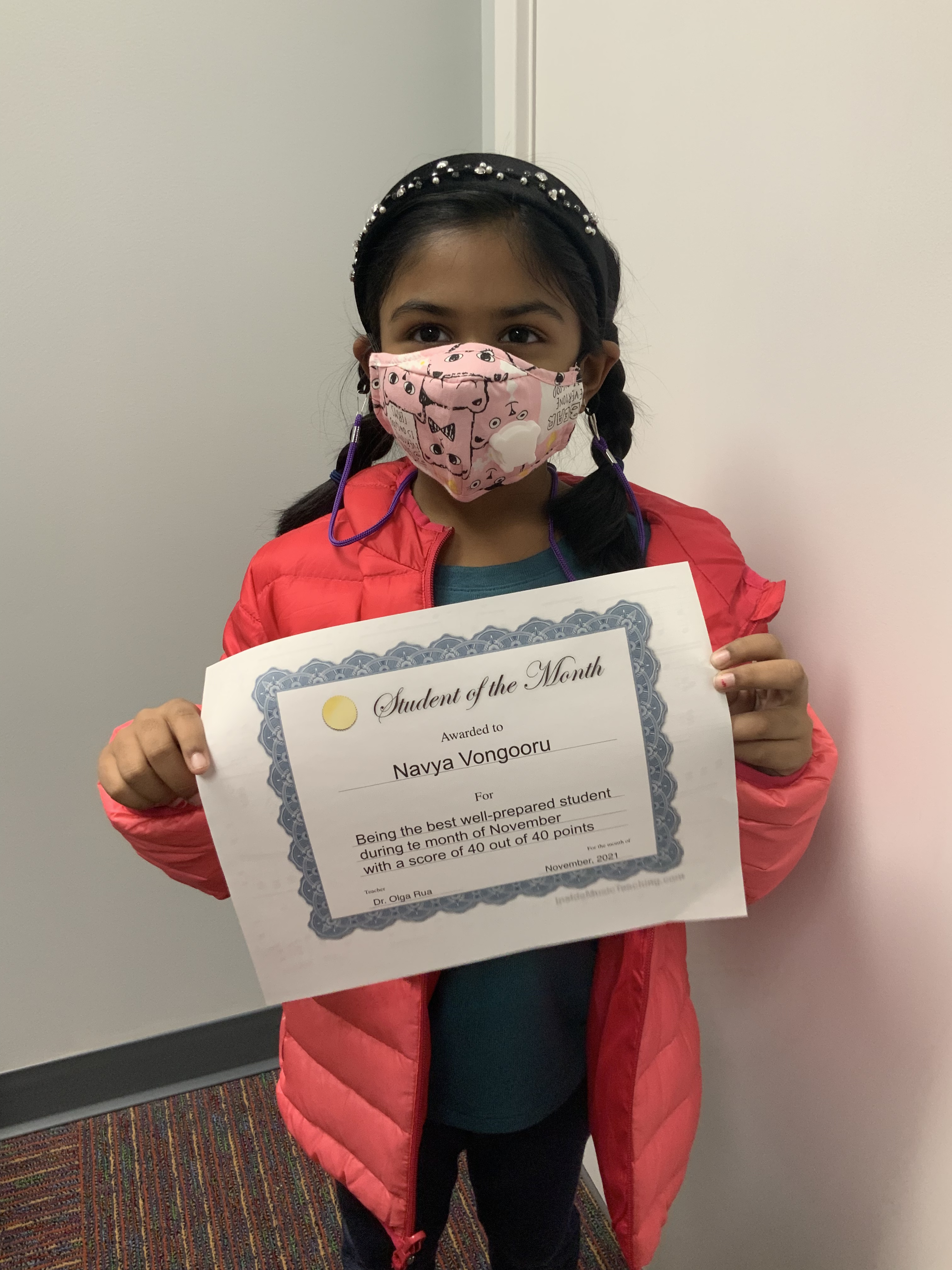 For the month of November, Dr. Rua Piano Studio has two “students of the month,” they are Navya Vongooru and Soren Fairfield. They achieve this with a score of 40 points out of 40.