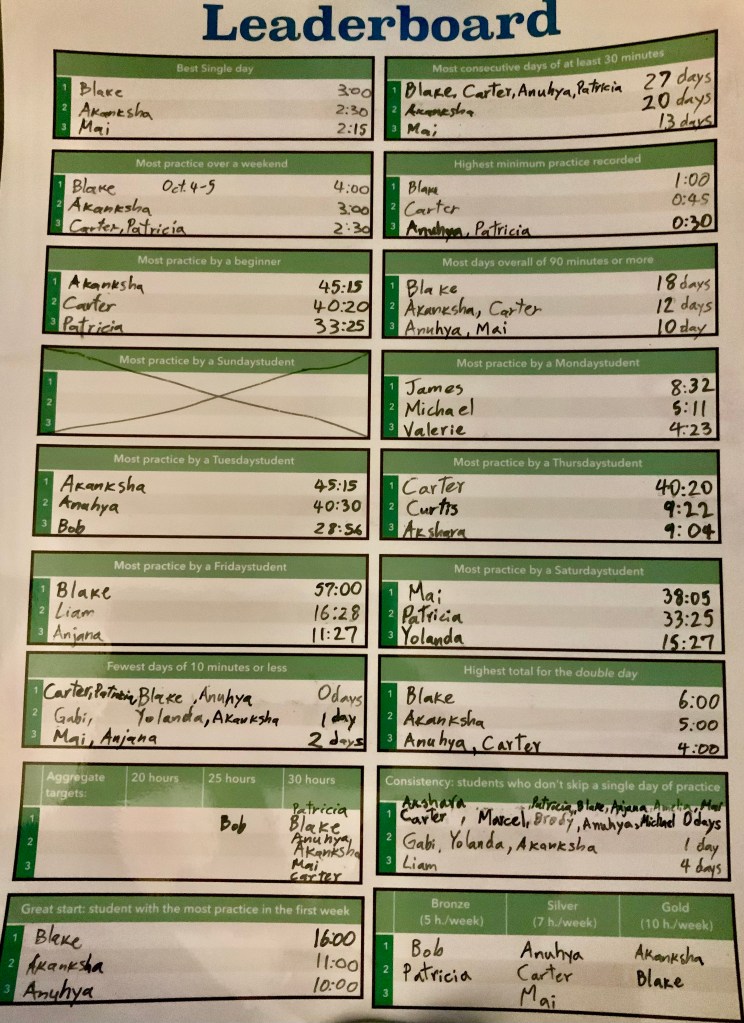 Starting September 29, start writing down in your sheet how many hours/minutes you practice per day. Parents must initial each practice session in the tracker in order for the times to count. Here is the link to the practice tracker: