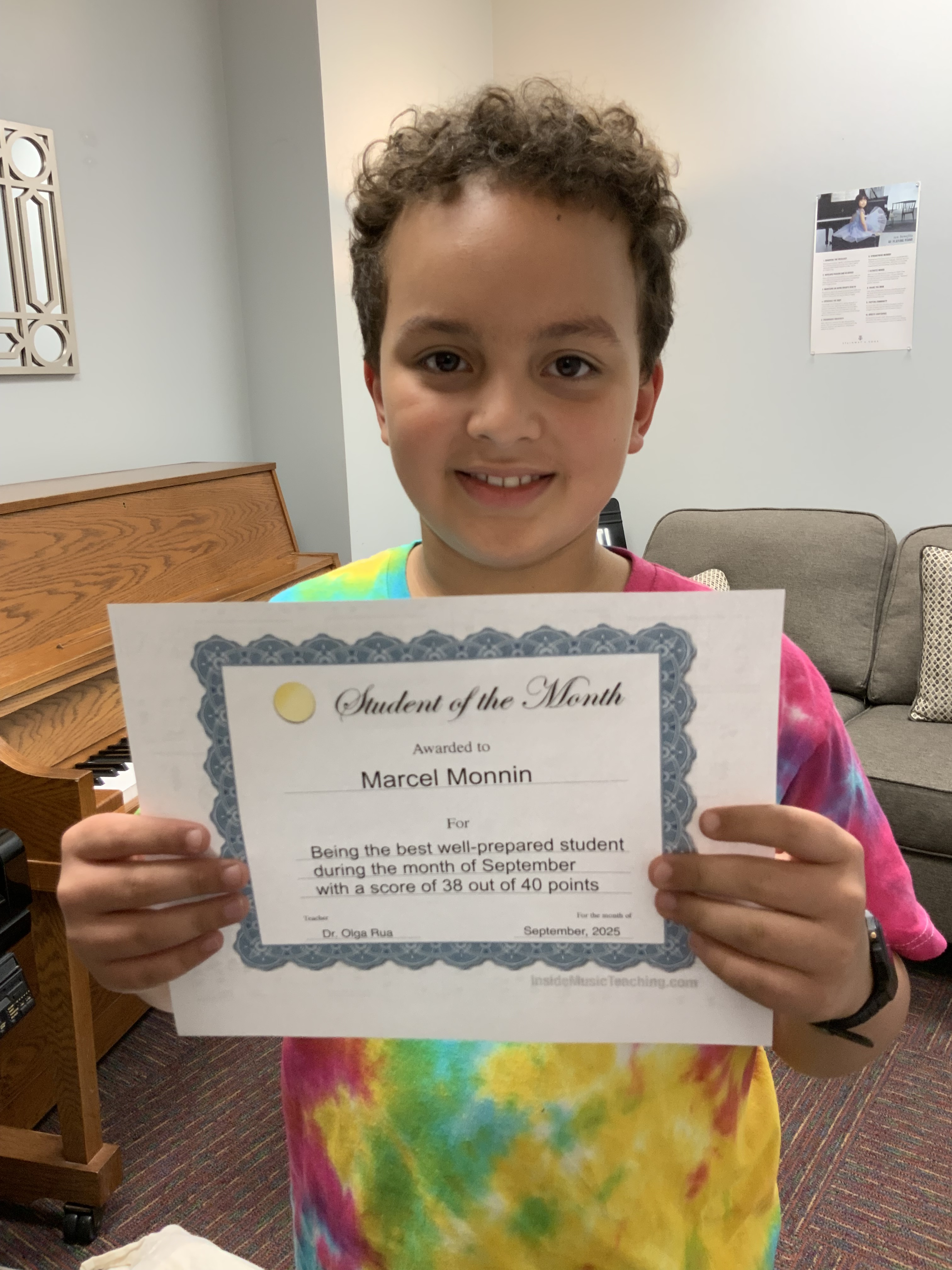 Starting the school year, our first Student of the Month for the 2025-2026 school year is Marcel Monnin. Congratulations to Marcel for being the best well-prepared student for his lessons this month with a score of 38 out of 40 points.